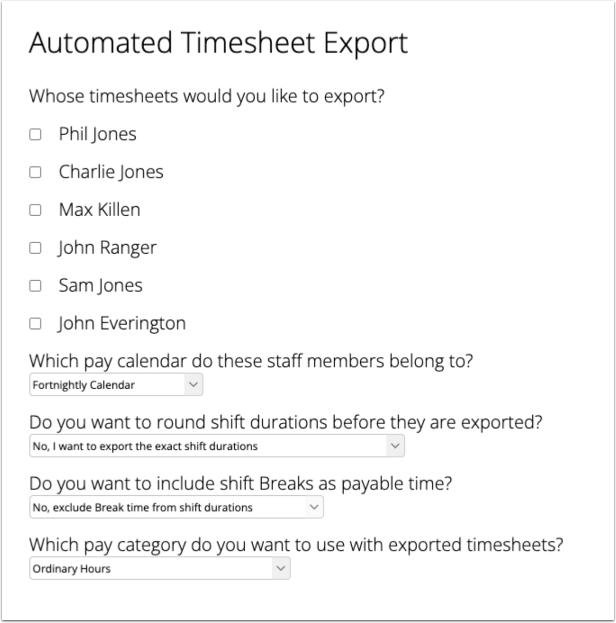 - Which staff members to export timesheets for;