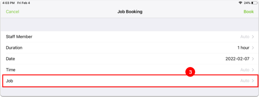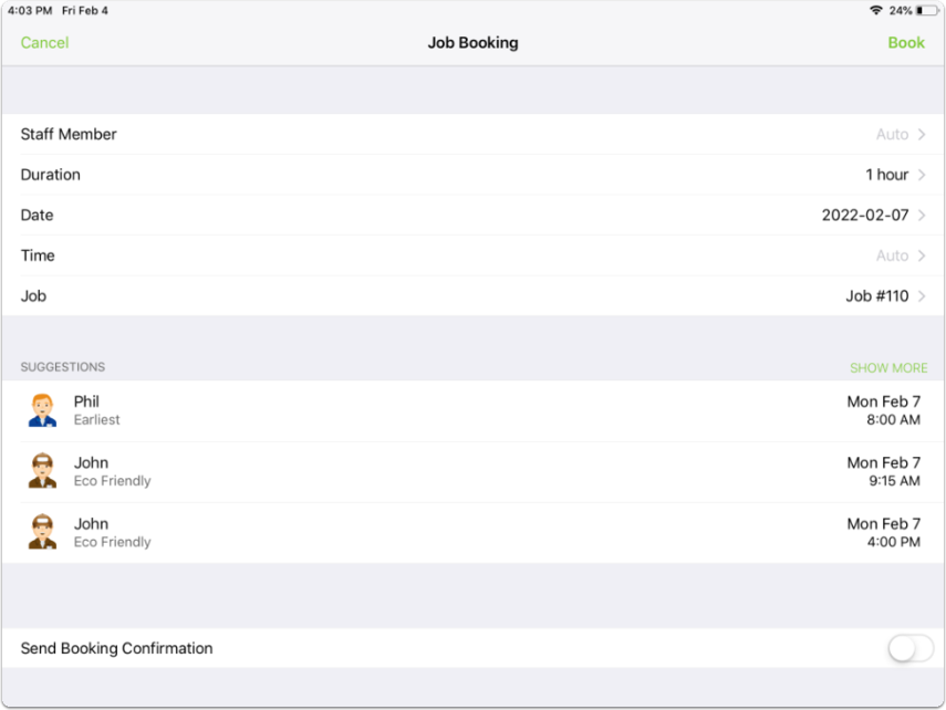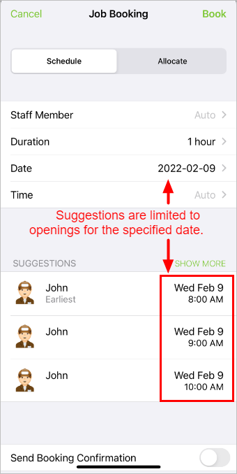 - Use booking suggestions to book the job to the earliest available opening, or to a specific staff member, time, or date. When you are satisfied, tap a suggestion, then tap Book.