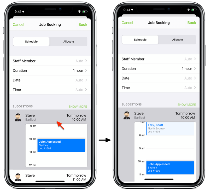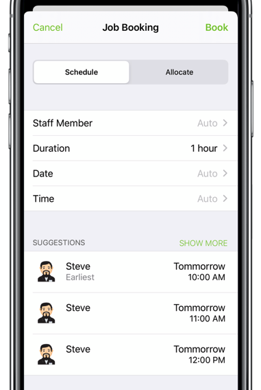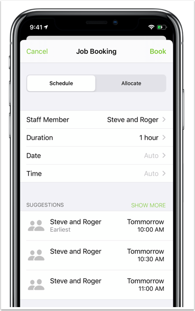 Tap a suggested time to see a preview of how it would work with the staff member’s current schedule