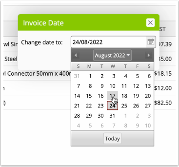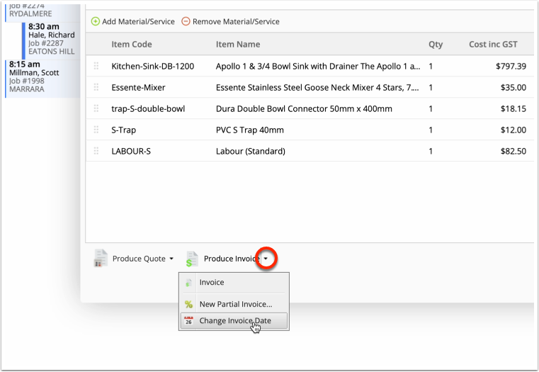 An invoice’s date can only be changed via its job card, in the Online Dashboard. To do so, click the drop-down to the side of the ‘Produce Invoice’ button, then ‘Change Invoice Date’.