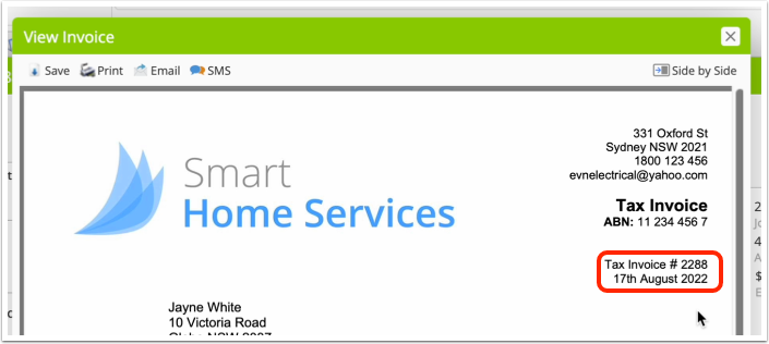 An invoice’s date can only be changed via its job card, in the Online Dashboard. To do so in the Enhanced Job Card, go to the Billing tab, and in the top-right corner, click the drop-down arrow, then “Customise Invoice” and you’ll find an option here to change the invoice date: