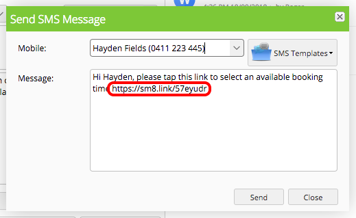 Click the “Booking Link” button to open the New SMS Message window, which is pre-filled with a message including a special single-use link for the customer to select an available time. You can tweak the message and choose the recipient, then click Send to send the message: