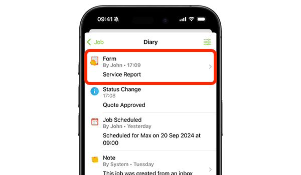 To edit a completed Form in the ServiceM8 iOS app, tap the saved Form you want to edit in the job’s Diary: