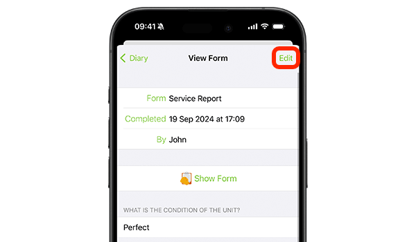To edit a completed Form in the Online Dashboard, click on the Form in the job’s Diary, then click ‘Edit Form’: