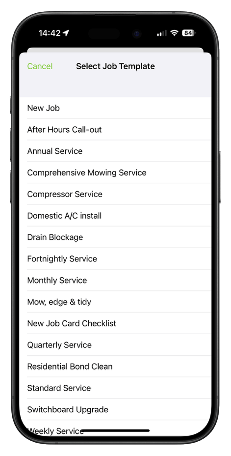 To apply a Job Template in the iOS app, in the Jobs tab, tap the plus (+) icon > New Job, and you’ll be presented with your list of Job Templates: