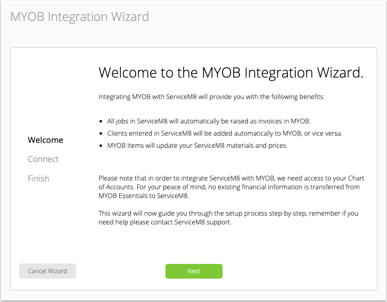 2. Welcome to the MYOB Integration Wizard, click Next to proceed