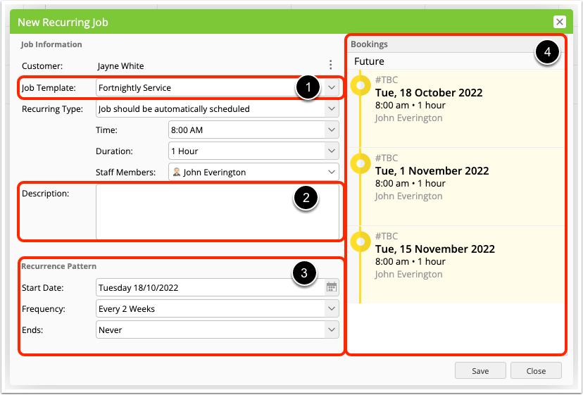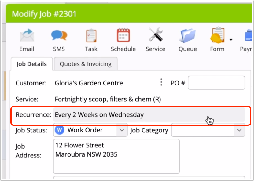 - “Recurring Jobs” are for regular/repeating work where the booking time and staff member is known, such as for daily, weekly or fortnightly service intervals.