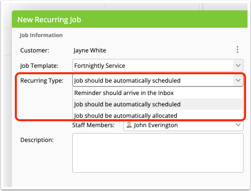 - Job should be automatically scheduled: set the job to automatically create & schedule itself to selected staff at a fixed time of the day (e.g. 8am), according to your recurrence pattern.