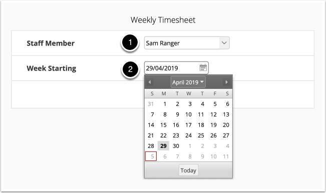 Select a staff member and the start date of the week you want to report on