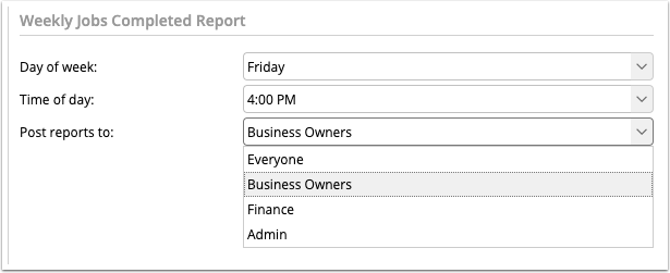 The Jobs Completed report has configurable settings around when the report will be posted to your Activity Feed, and which staff roles within your account will be able to view it. This is configurable in Settings > Preferences > Reports > Weekly Jobs Completed Report.
