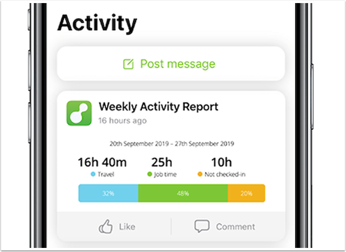 Checked-In time percentage is calculated by dividing the total hours Checked In by the total working staff-hours for the reporting period. These total working staff-hours are based on your company operating hours, configured in Settings > Preferences > Company Information. For example, consider a fictional business operated by John, a sole trader. His operating hours are 9:00 AM - 5:00 PM Monday - Friday (40 hours total). If John checks in for 4 hours each day, his total checked-in hours would be 20 which would result in 50% checked-in time. If John hires a second staff member who also checks in for 4 hours each day, the business’s total checked-in hours would increase from 20 to 40, but the checked-in time percentage would still be 50%, because the total working staff-hours for the business have also increased from 40 to 80 (40/(40*2)=50%). Note that if a staff member does not check in at all during the reporting period (common for admin/office staff), their working hours will not contribute to the total working staff-hours. So, if John hires a third staff member who only works in the office and doesn’t check-in to any jobs, the overall checked-in time percentage will not change because the office-only employee’s working hours will not be included when calculating the checked-in percentage. Finally, if a staff member uses the clock-on and clock-off functions in the ServiceM8 app, these recorded times will be used instead of the company operating hours to calculate the checked-in percentage. “Travel” time is the amount of time spent Navigating to jobs in ServiceM8 i.e. when you tap ‘Start Job’ then ‘Navigate to Job’, and the travel timer displays.How do I activate the Weekly Activity Report?