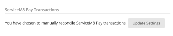 To activate this feature, or update your reconciliation settings, in your online dashboard, go to Account > Settings > Preferences > Invoicing > ServiceM8 Pay Transactions: