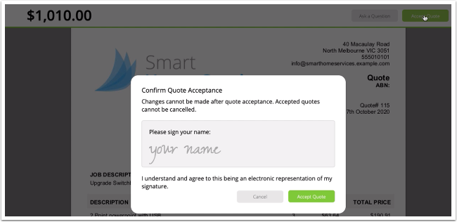 Learn how to send quotes for remote signature in ServiceM8. You can require your customers to sign quotes remotely upon acceptance when you send them the quote.